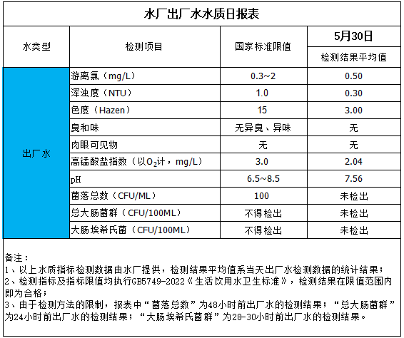 水廠出廠水水質(zhì)日?qǐng)?bào)表(2025-5-30)