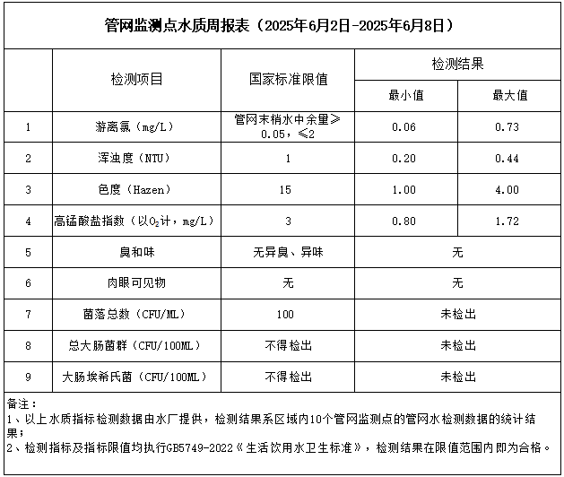 管網(wǎng)監(jiān)測點水質(zhì)周報表(2025年6月2日-2025年6月8日)