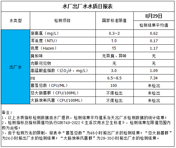 水廠出廠水水質(zhì)日?qǐng)?bào)表(2025-8-29)