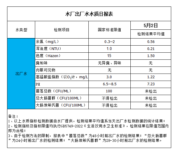 水廠出廠水水質(zhì)日報表(2023-5-2)
