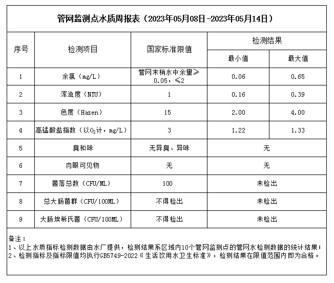 管網監(jiān)測點水質周報表(2023年05月08日-2023年05月14日)