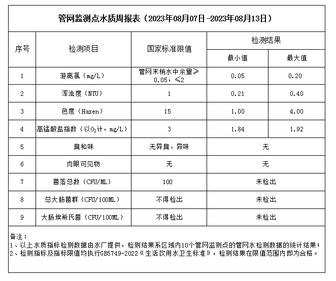 管網(wǎng)監(jiān)測點水質周報表(2023年08月07日-2023年08月13日)