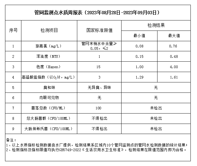 管網(wǎng)監(jiān)測(cè)點(diǎn)水質(zhì)周報(bào)表(2023年08月28日-2023年09月03日)