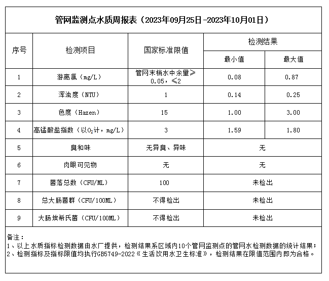 管網(wǎng)監(jiān)測點水質(zhì)周報表(2023年09月25日-2023年10月01日)