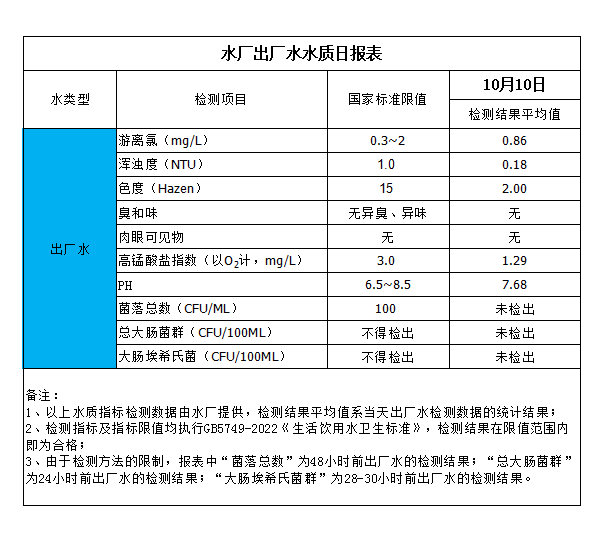 水廠出廠水水質(zhì)日報(bào)表(2023-10-10)