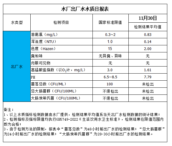 水廠出廠水水質(zhì)日報表(2023-11-30)