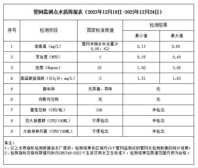 管網(wǎng)監(jiān)測點水質(zhì)周報表(2023年12月18日-2023年12月24日)