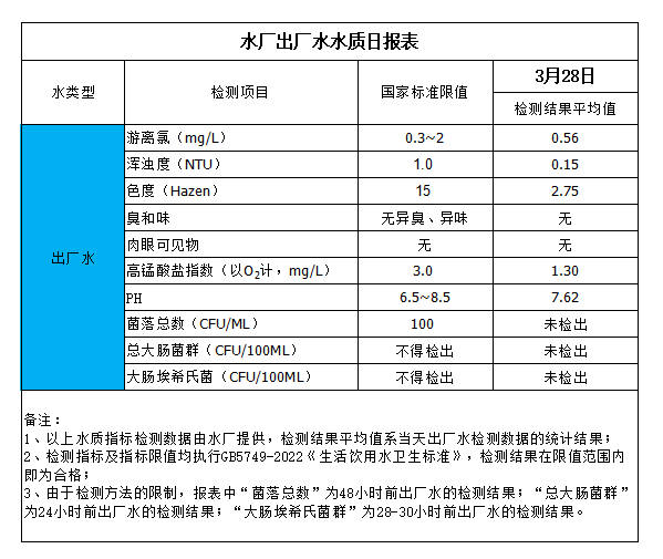 水廠出廠水水質(zhì)日報表(2024-3-28)