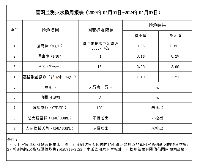 管網(wǎng)監(jiān)測點水質(zhì)周報表(2024年04月01日-2024年04月07日)