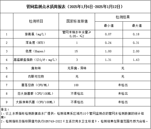 管網(wǎng)監(jiān)測點(diǎn)水質(zhì)周報(bào)表(2025年1月6日-2025年1月12日)